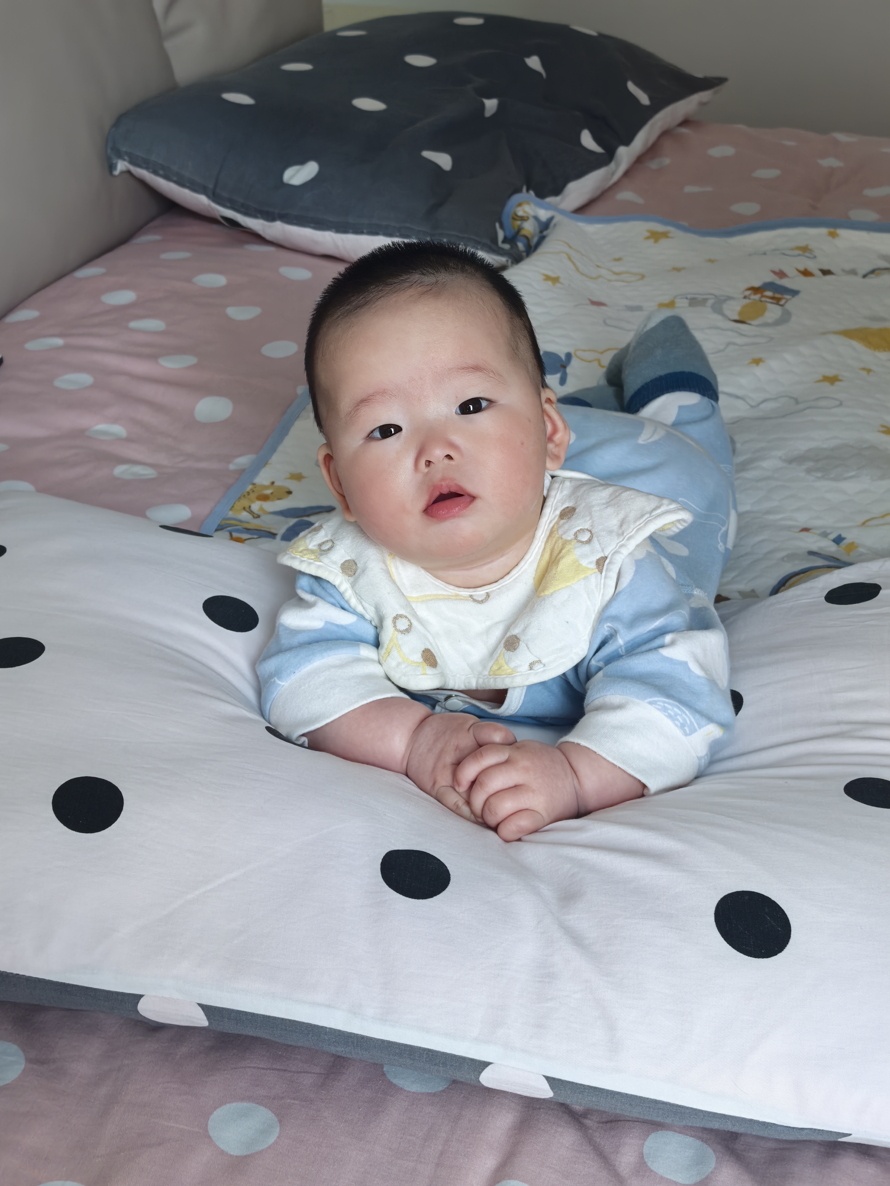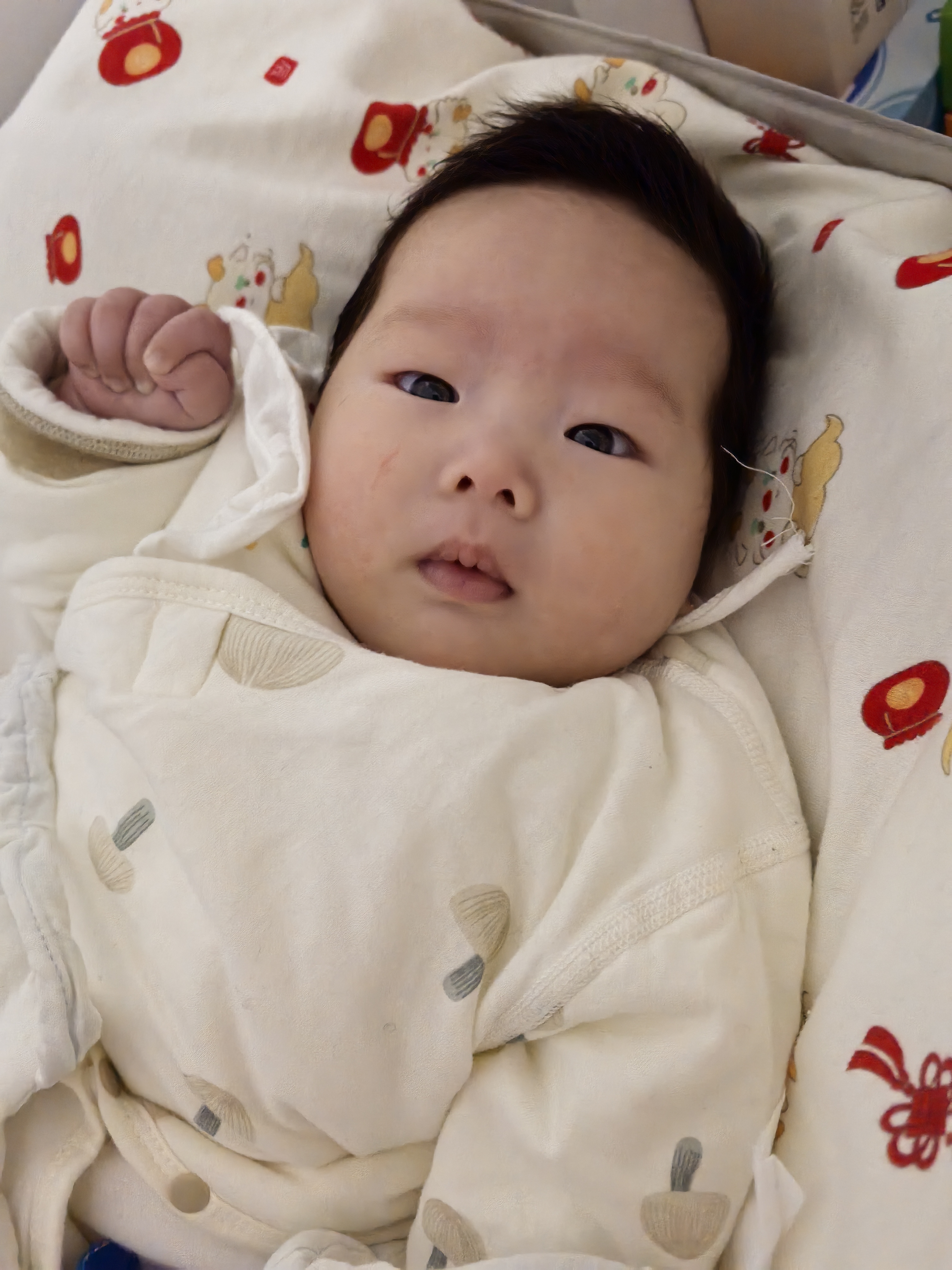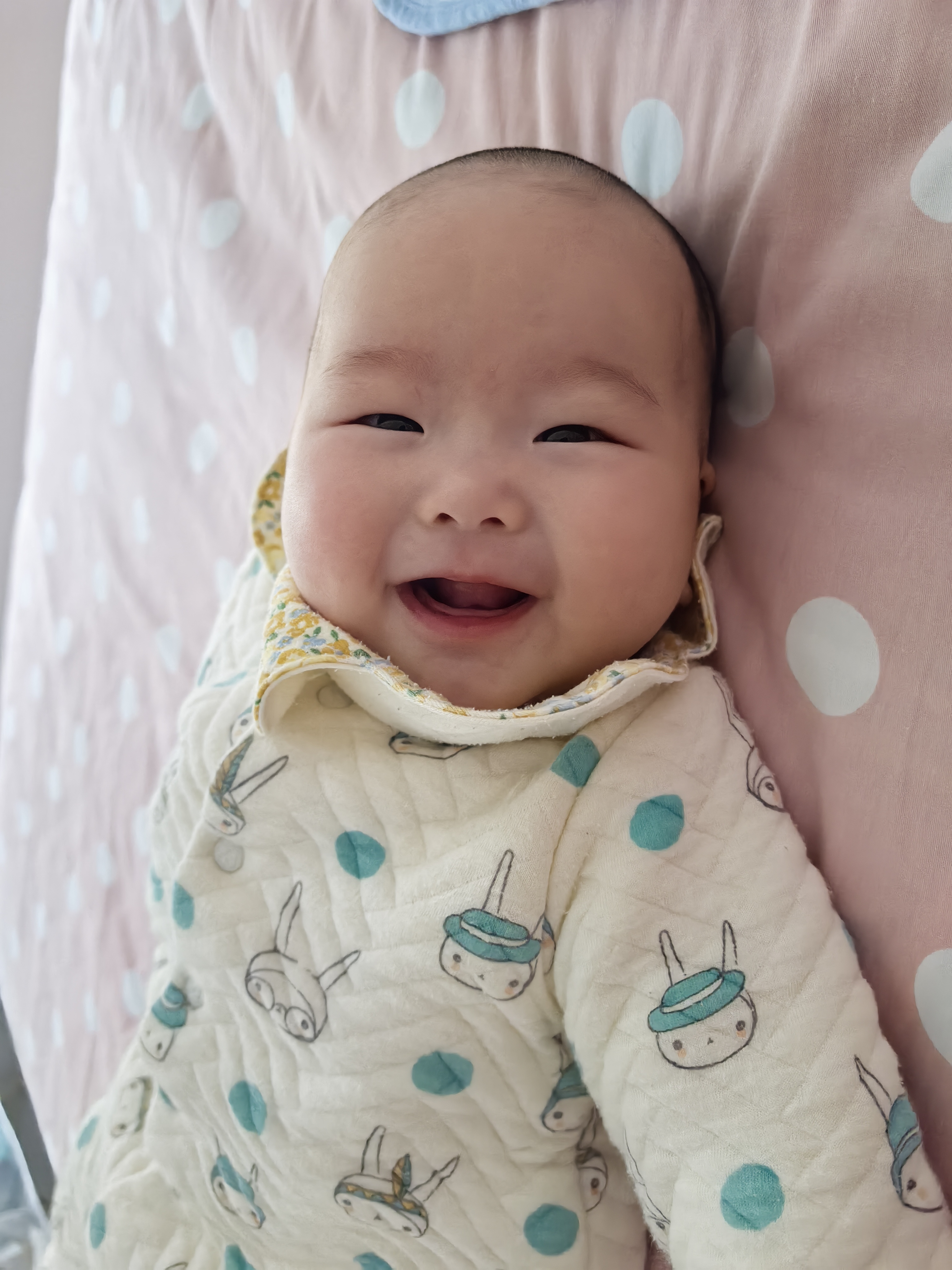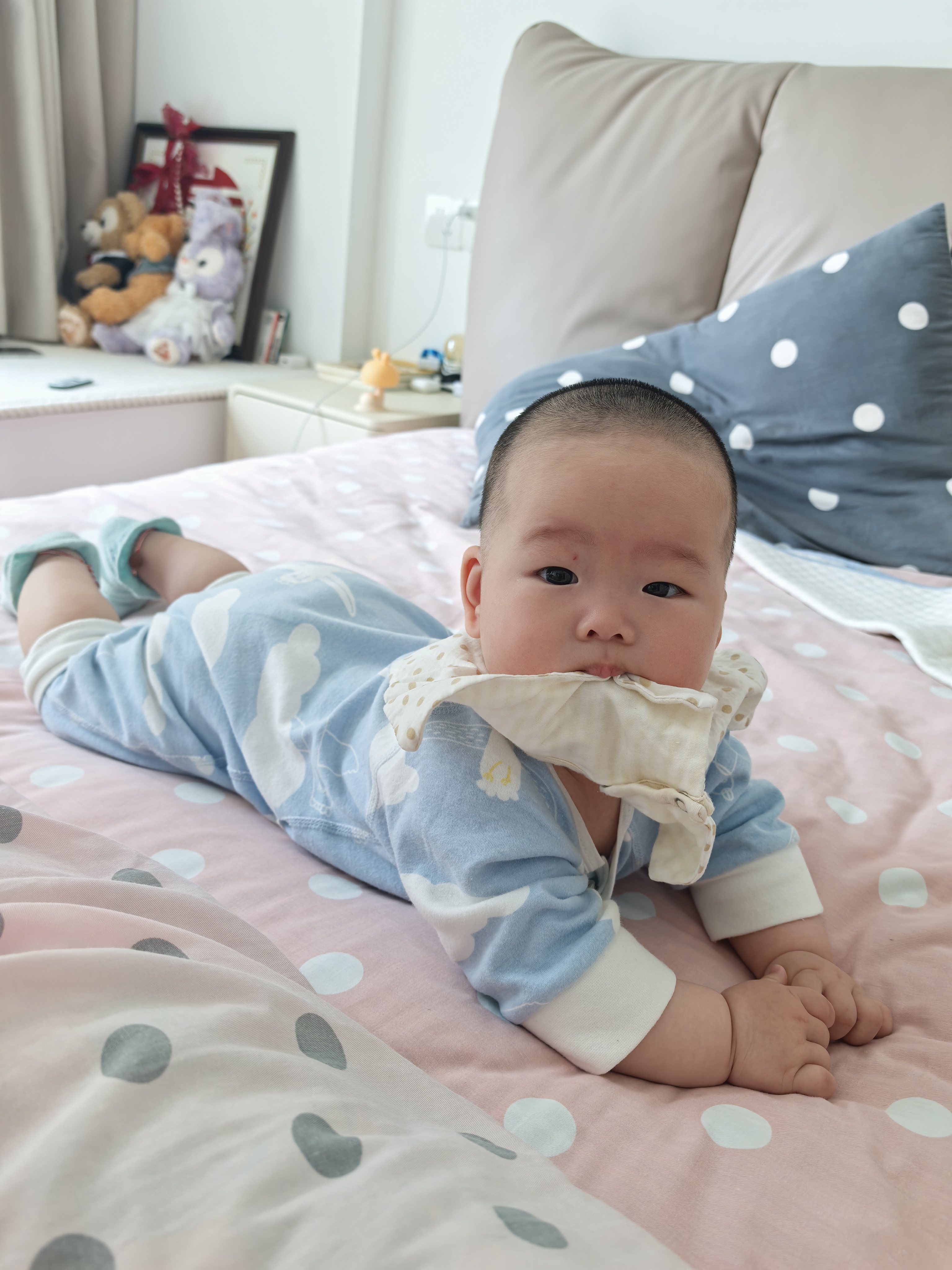 - 三个月的你变得更加活泼好动,开始发出各种可爱的声音,仿佛在和我们交流。趴着的时候能抬头看周围的世界,对一切都充满了好奇。