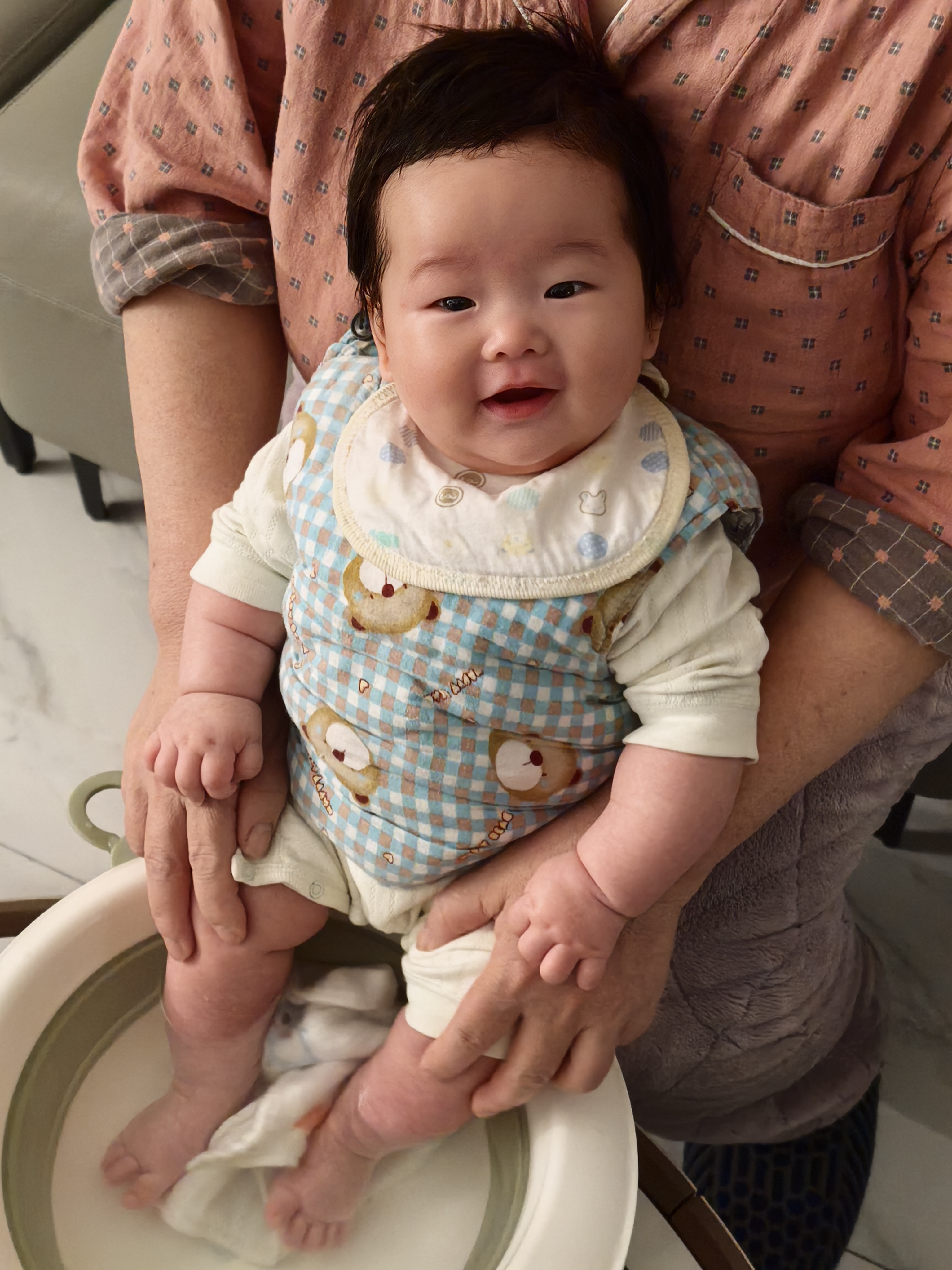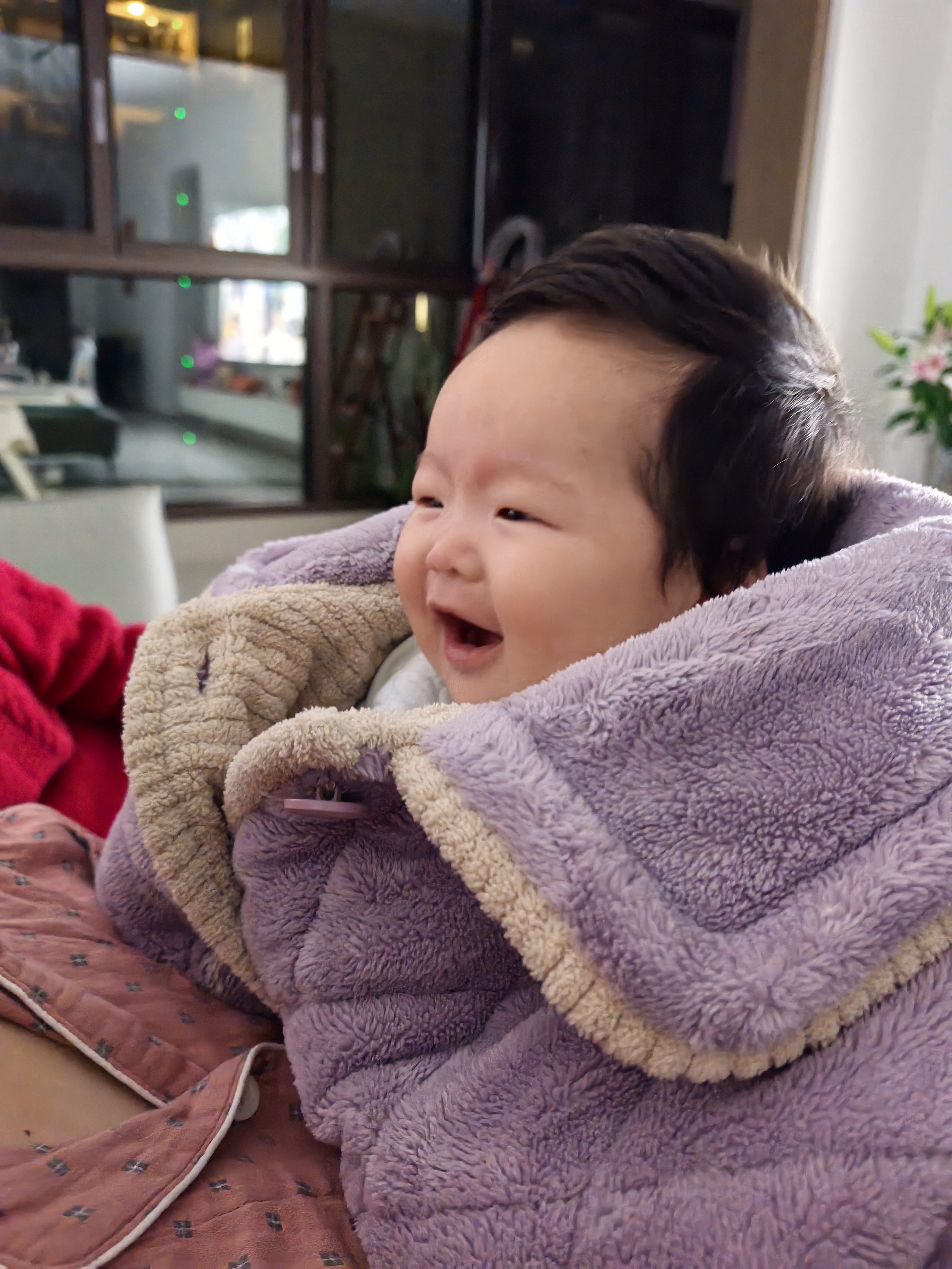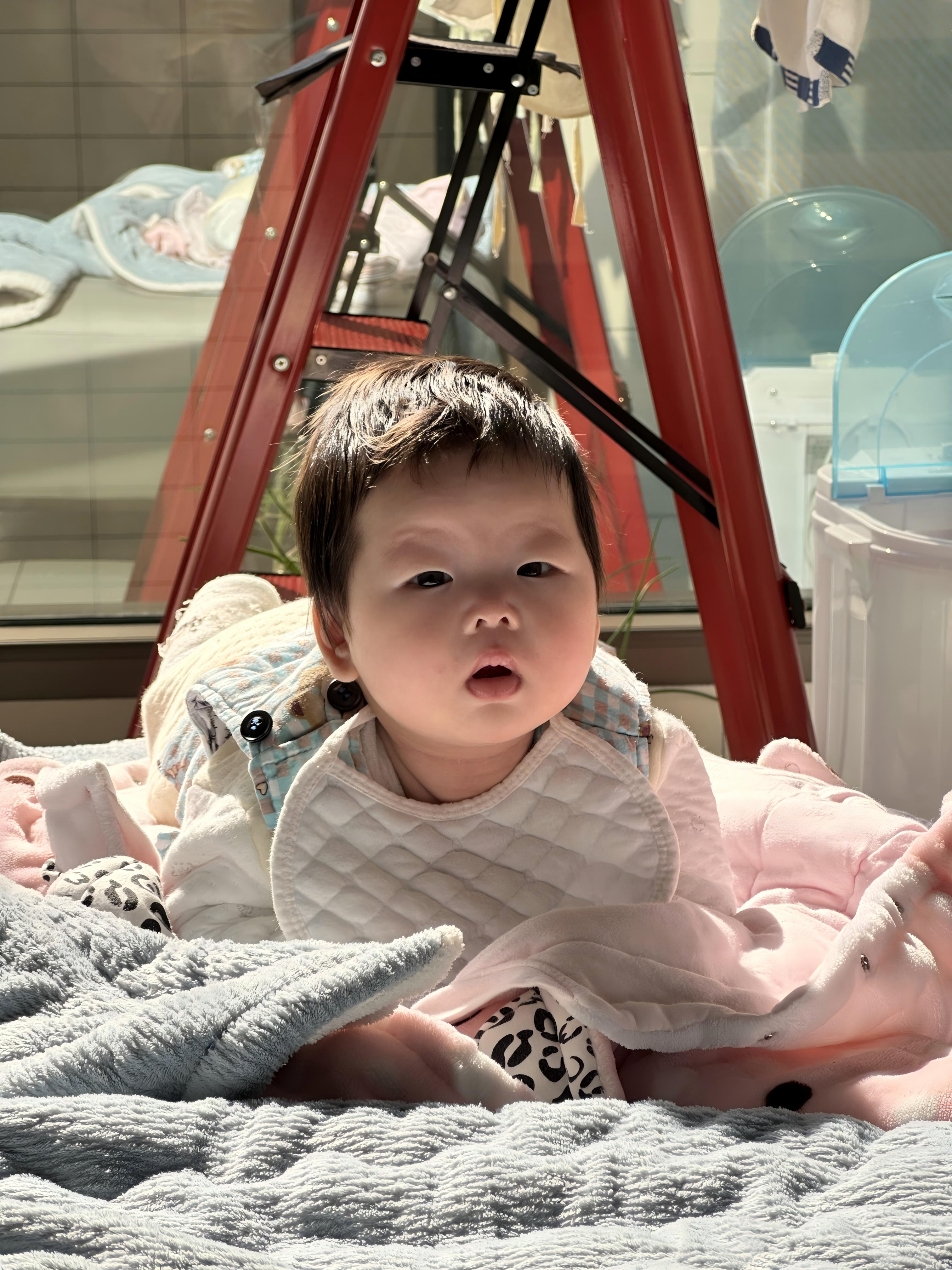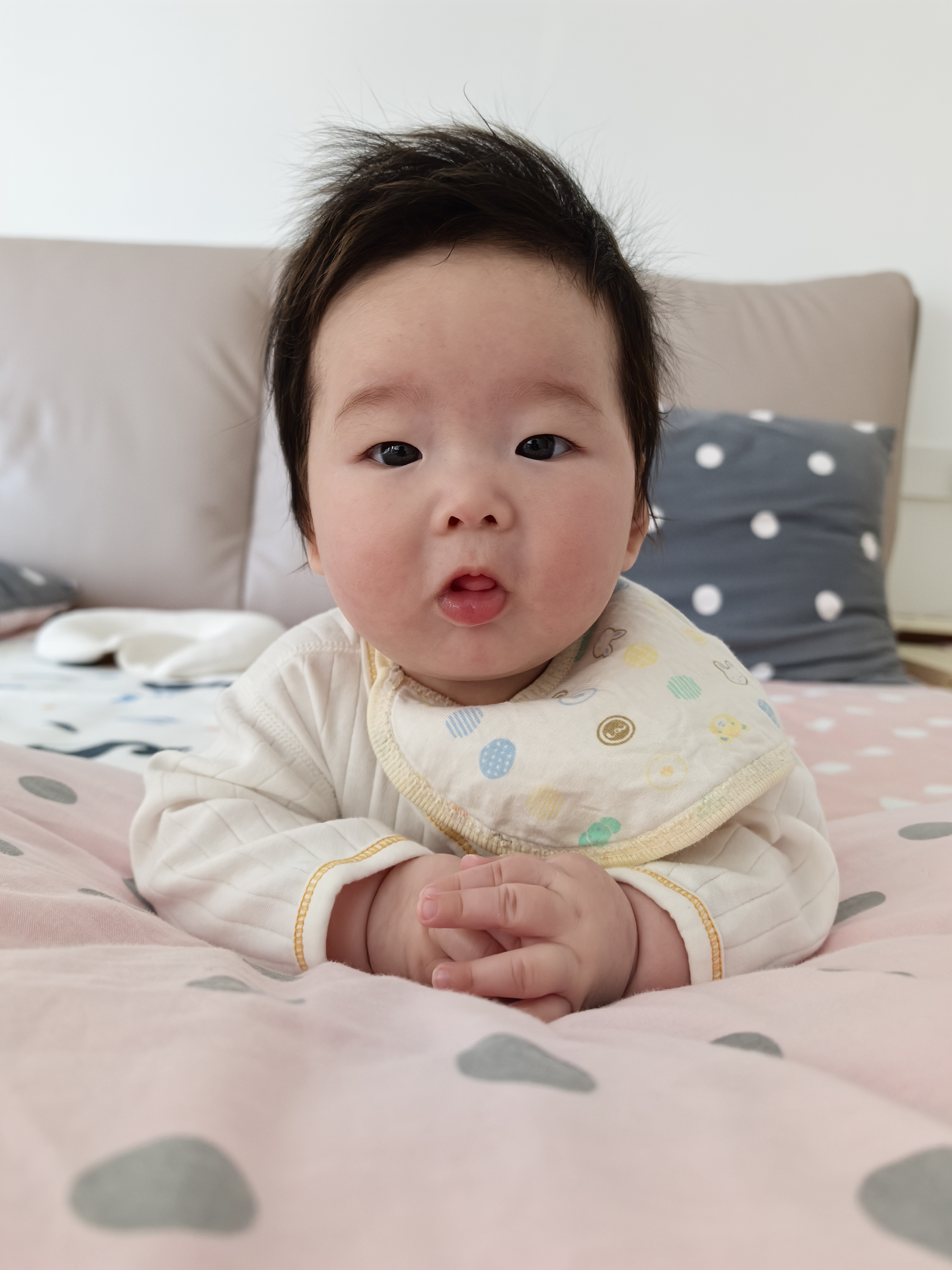 - 三个月的你变得更加活泼好动,开始发出各种可爱的声音,仿佛在和我们交流。趴着的时候能抬头看周围的世界,对一切都充满了好奇。